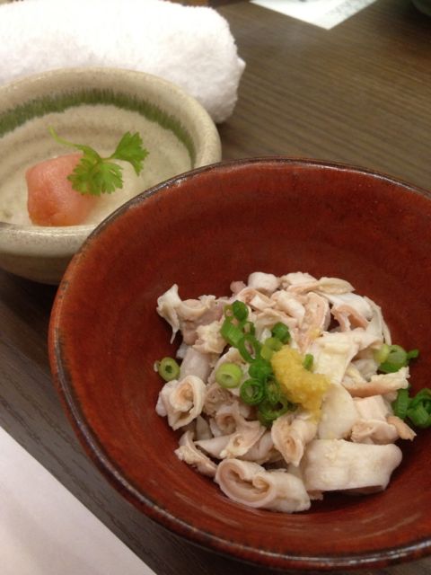 まずは小鉢が2品。博多ということで明太子と鶏皮のポン酢あえが出てきました。
