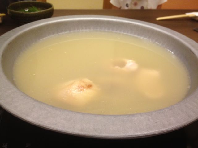 最初にスープが出て来たのですが、これ、骨付きのぶつ切り肉を数時間煮込んだコラーゲンたっぷりのお出汁。トロッとしてて、鶏のうまみがいい感じで出ています。