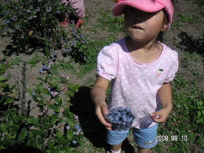 ブルーベリーは丈が低いし、ぽろぽろと手で採れるので、小さい子でも楽しめます。