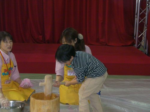 順番にきねを持ってついてみました。ついた後は、スタッフの方がきなこもちを作って配ってくれました。つきたてはとっても柔らかくておいしかったです。