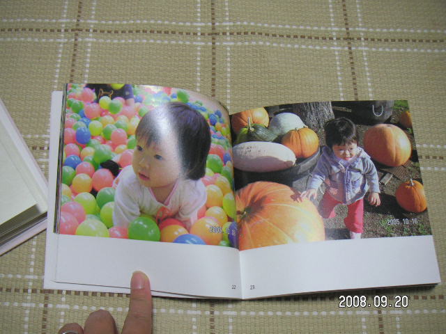 こちらはCDサイズ。表紙などは20種類くらいのパターンから選びます。ハードカバーではありません。で、写真は1ページに1枚。コメントなどは余白部分に自分で書き込むことになりますね。