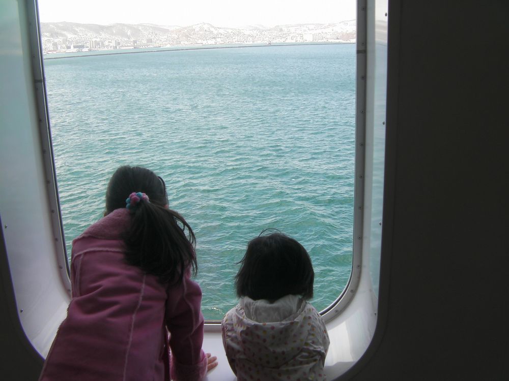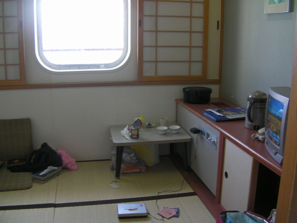日中はよかったのですが、夕方くらいから船がかなり揺れだしました。はるままも気持ち悪くてとても食事をする気分になれず、でも胃に何かいれなと余計気持ち悪くなるかなと思い、レストランでライスとみそ汁だけとりました。一緒のばばもダウン。上の娘も頭痛がするといってほとんど食事をせず。下の子は元気でした。小さいとあまり乗り物酔いしないんですかね・・・。